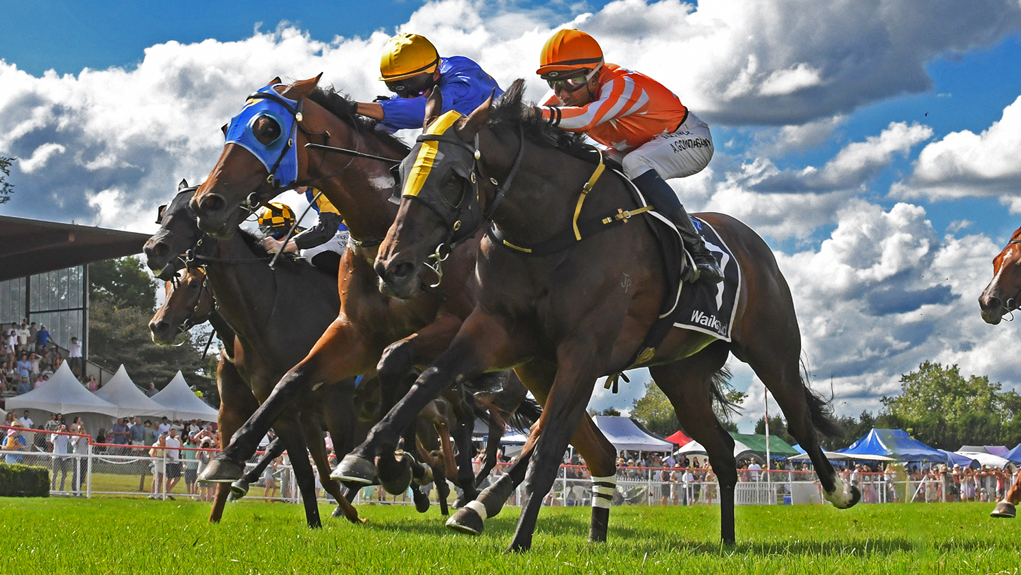 The six-year-old settled on the outside of the leader through the early stages of the race, then quickened coming up to the home turn to stake her claim. She was quickly joined by Langkawi (NZ) (Helmet), with Aotea Lad (NZ) (Savabeel) charging through along the rail, but Saint Alice dug deep and held them both out in a tight finish.