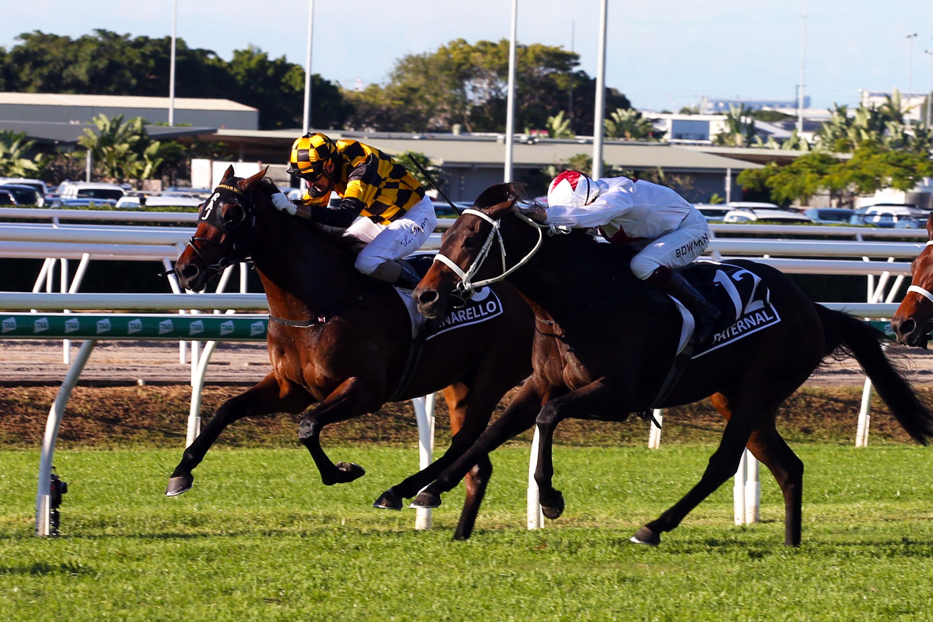 Pinarello had already proven himself as one of New Zealand’s better three-year-olds, winning three races headed by a brilliant last-start romp in the Group Two Championship Stakes (2100m) at Pukekohe in April. He also finished an unlucky fifth in the Group One New Zealand Derby (2400m) in early March. But it was in Queensland’s most prestigious three-year-old race at Eagle Farm on Saturday afternoon that he truly lived up to the esteem that trainers Roger James and Robert Wellwood have always had for the Tavistock gelding.